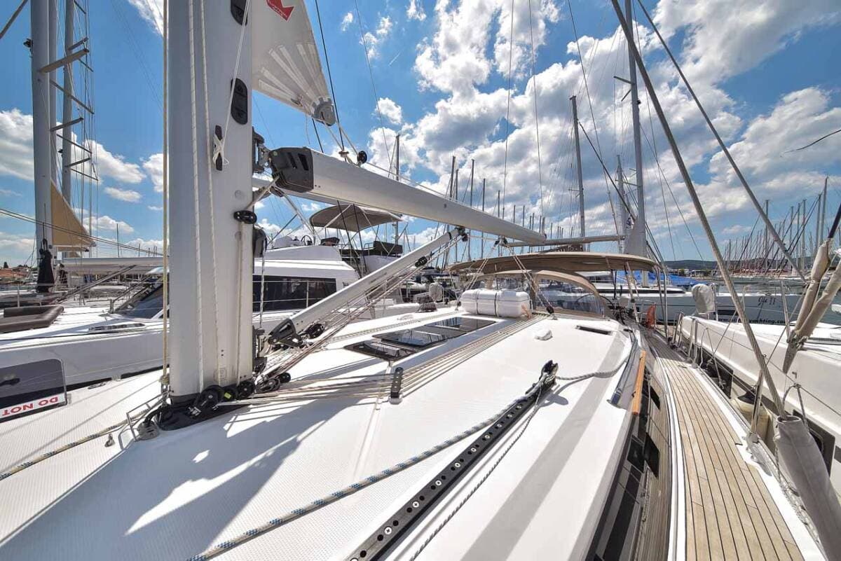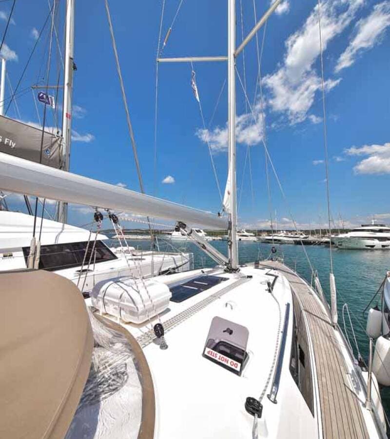 - DeckAnchor lineAnchor swivelBathing platformBimini topBlack ballBlack conusBoat hookBosun's chair (Safe seat) (boatswain's chair)Canister for waterCockpit table with lightCockpit/stern, outside showerDinghyDinghy (byboat) pumpElectric anchor windlassFendersGalley in cockpitGangway HawserImpeller, V-belt, oilfilterJerry cans for dieselMain anchor Mooring ropes Plastic bucketRepair box for dinghyRound/globular fenderSpare anchor (Reserve, Auxiliary anchor) Spotlight / HeadlightsSprayhoodSpring lineTeak deckWater hose