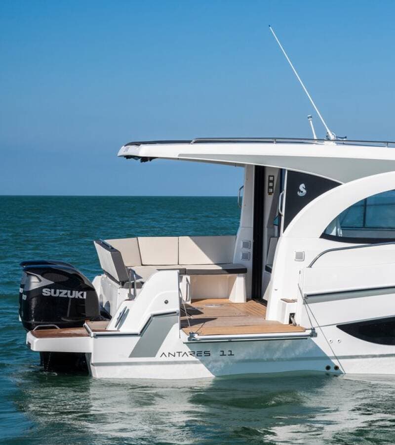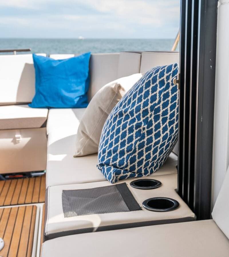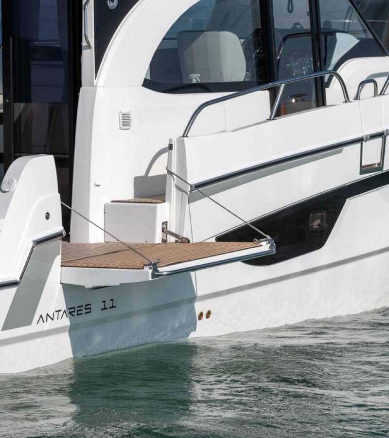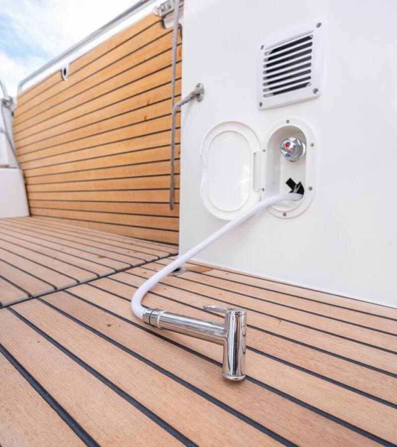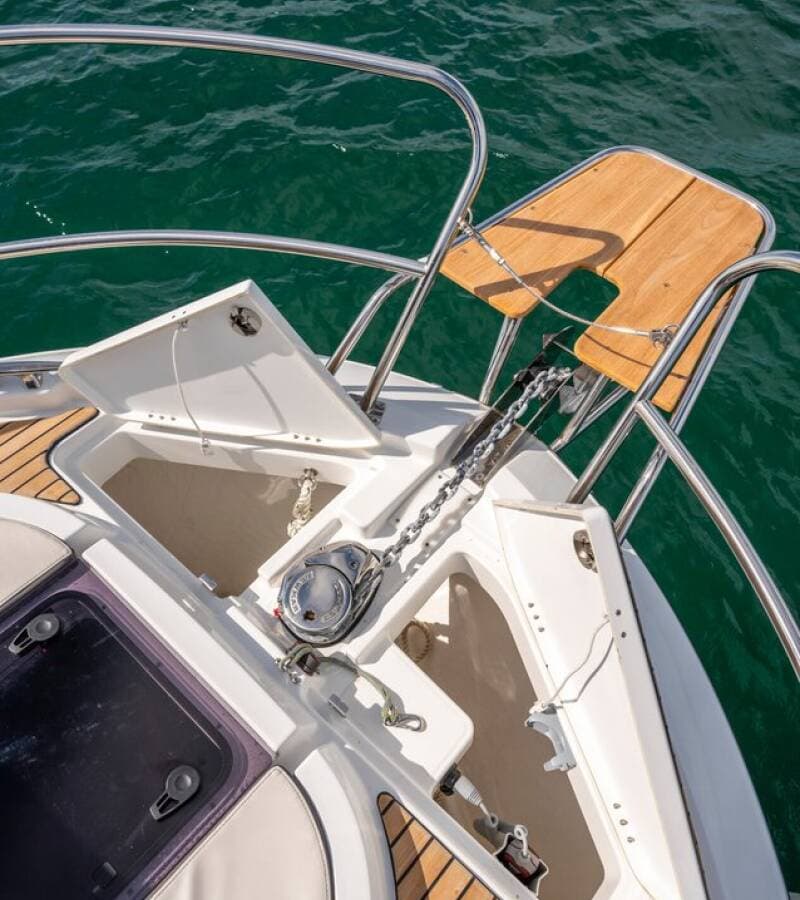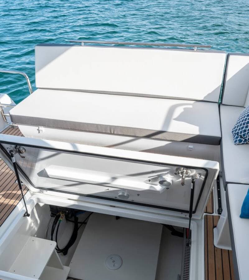 - DeckBathing platformBimini topCockpit fridge Cockpit/stern, outside showerElectric anchor windlassFridge on flybridge GangwayMain anchorSpare anchor (Reserve, Auxiliary anchor)Teak cockpitTeak deck