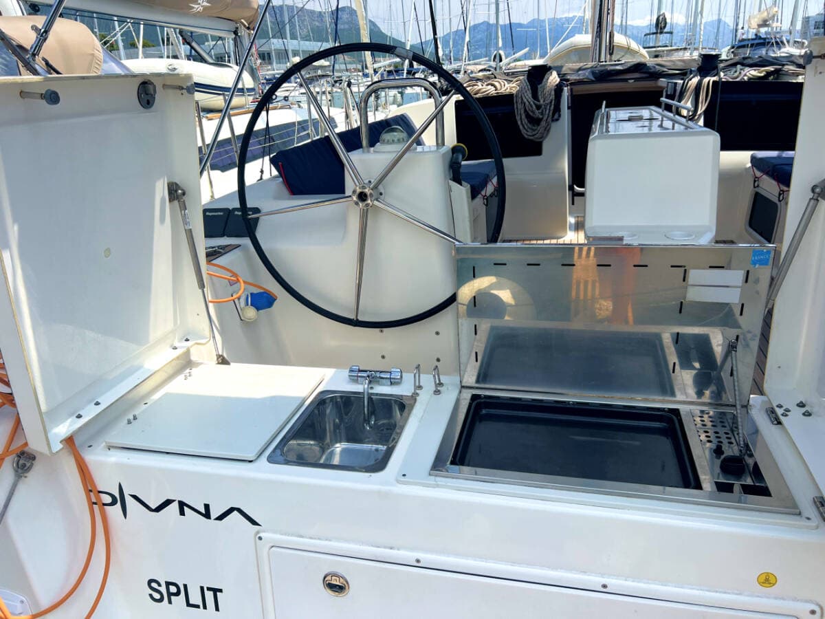- DeckBathing platformBimini topBosun's chair (Safe seat) (boatswain's chair)Cockpit grillCockpit tableCockpit/stern, outside showerDeck brushDinghyElectric anchor windlassFendersGangwayGasoline Main anchor Main Deck CompassMooring ropes Outboard engine Plastic bucketSpare anchor (Reserve, Auxiliary anchor) SprayhoodTeak cockpitWater hoseWinch handles