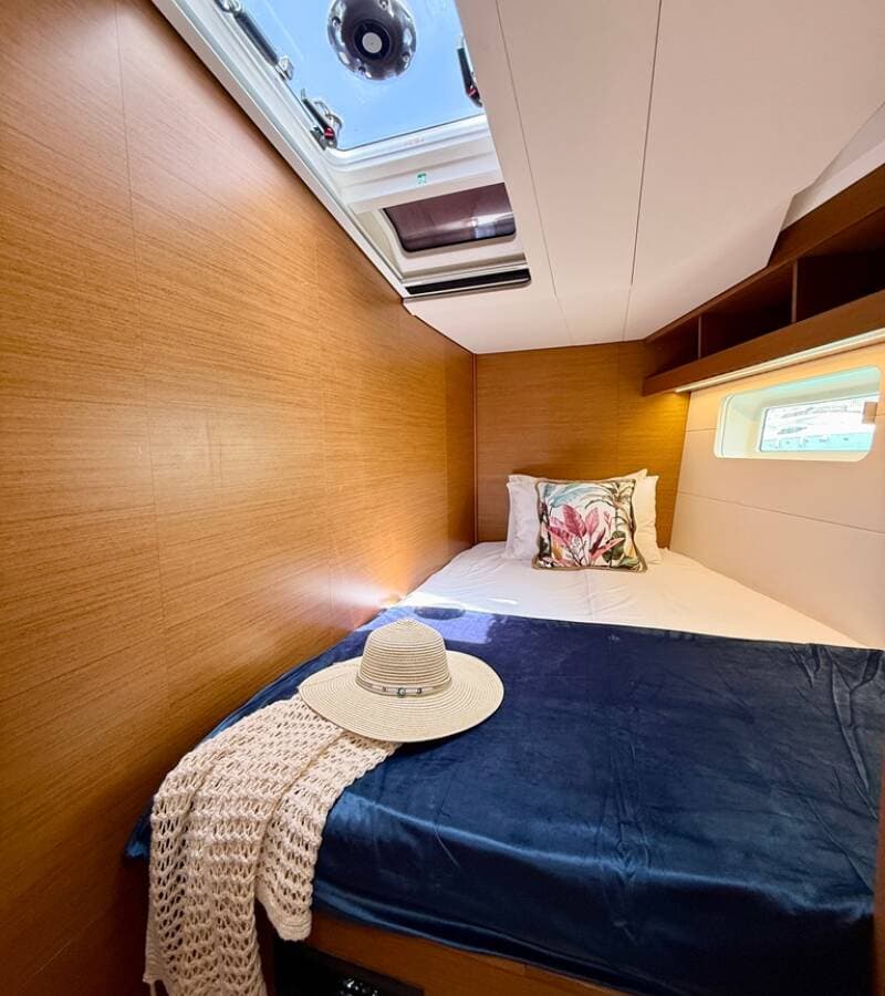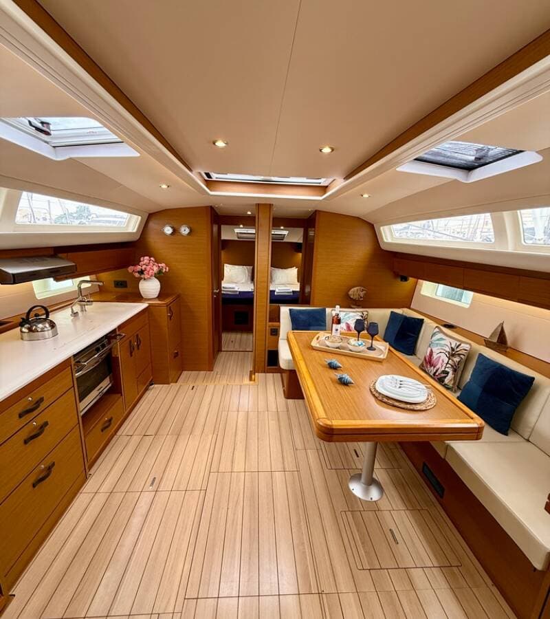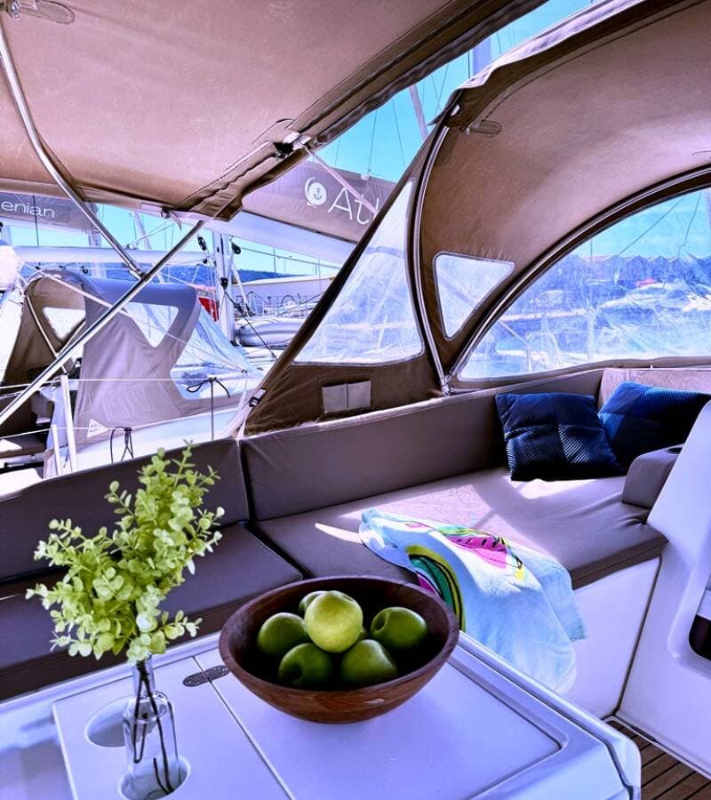 - DeckBimini topCockpit tableCockpit/stern, outside showerDinghyElectric anchor windlassHydraulic gangwayOutboard engineSprayhoodSwimming ladderTeak cockpit