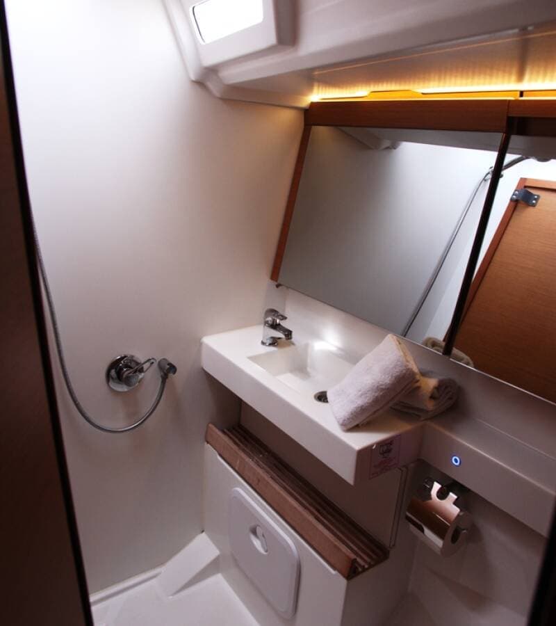 - DeckBimini topCockpit tableCockpit/stern, outside showerDinghyElectric anchor windlassOutboard engineSprayhoodSwimming ladder