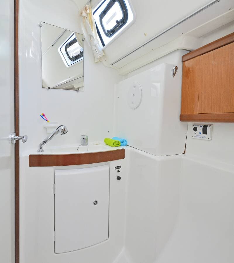 - SafetyDistress flare boxEmergency tillerFire extinguisher First aid kit Flags QNCFog hornLife belts (Safety harness)Life buoy + Flashing lightLife jacketsLiferaft TorchVHF radio Wire (shroud) cutter