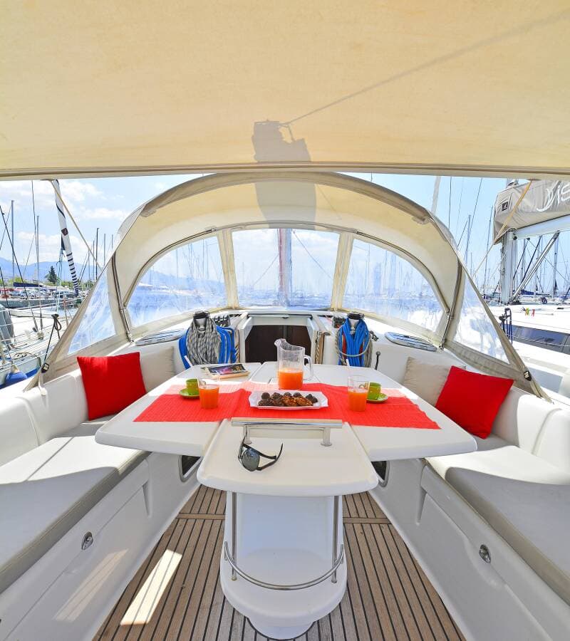 - DeckAnchor with chainBimini topBlack ballBoat hookDinghyDinghy with outboard engineElectric anchor windlassFendersGangwayOutboard engineSpare anchor (Reserve, Auxiliary anchor)SprayhoodSwimming ladderWater hoseWinch handles
