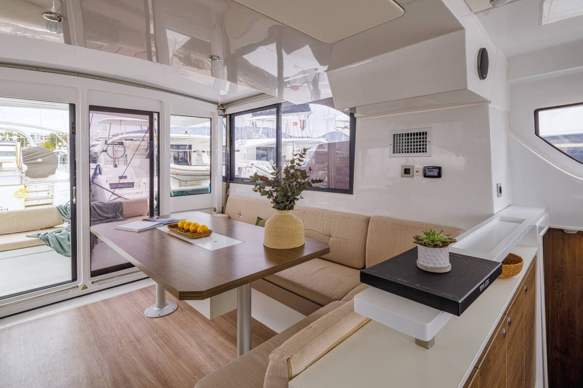 - DeckBimini topCockpit/stern, outside showerDavitDinghyElectric anchor windlassGangwayOutboard engineSwimming ladder