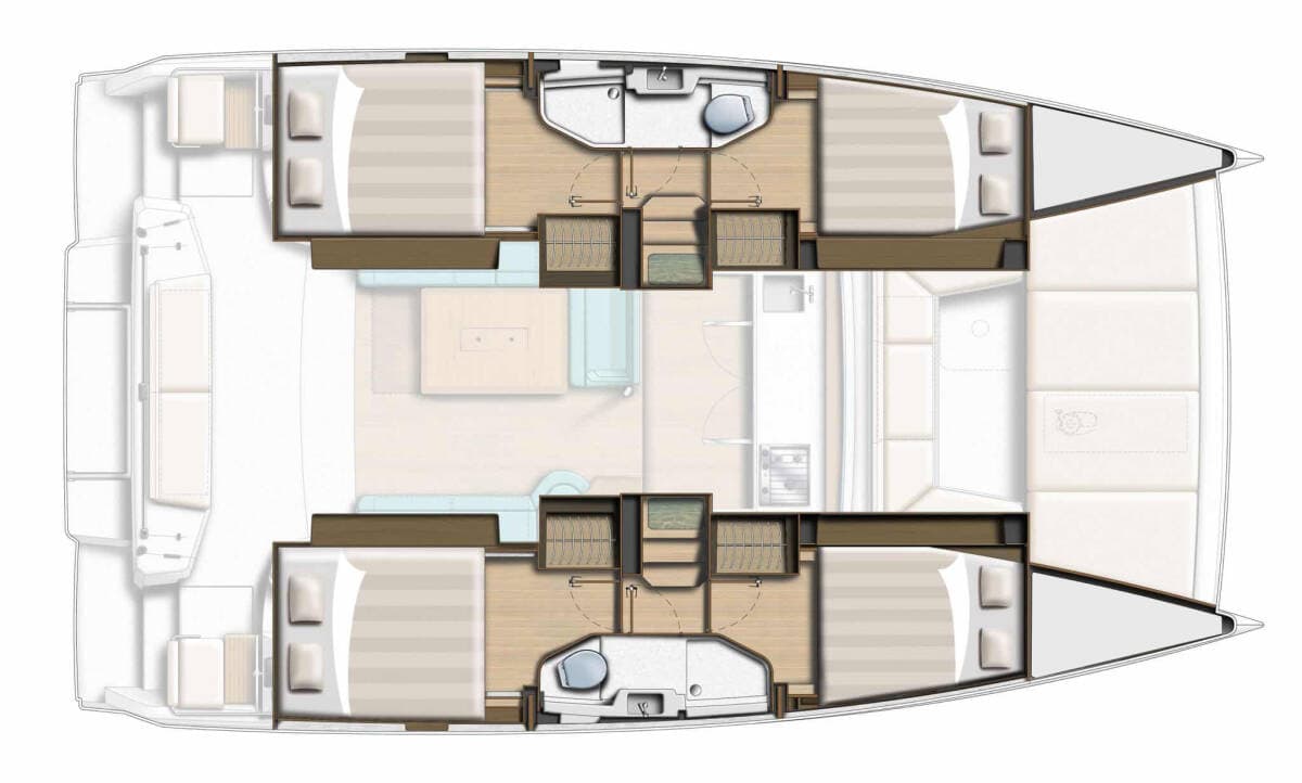 - DeckBimini topCockpit tableCockpit/stern, outside showerDavit DinghyElectric anchor windlassOutboard engineSwimming ladder