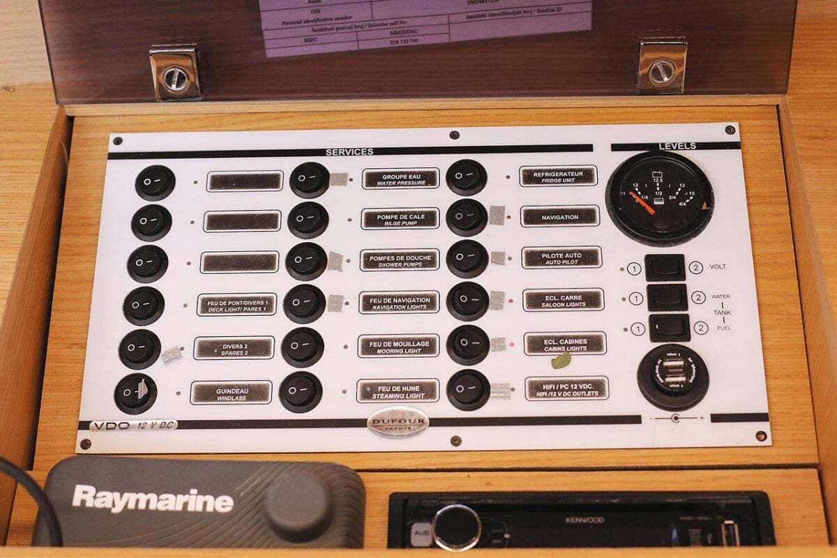 - SafetyDistress signalsFire extinguisher First aid kit Life jacketsLiferaft VHF radio